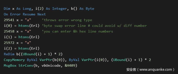 错误行号可以通过Erl()函数进行访问。VB6对每个函数的行号限制为0xFFFF,行号值必须在0-0xFFFF范围内。由于使用这种技术时,嵌入数据的大小受到限制,因此,这种方法仅适用于短字符串,如密码和网址等。