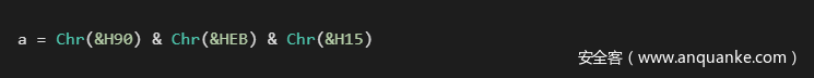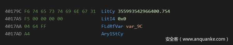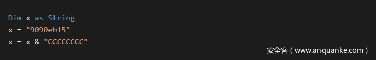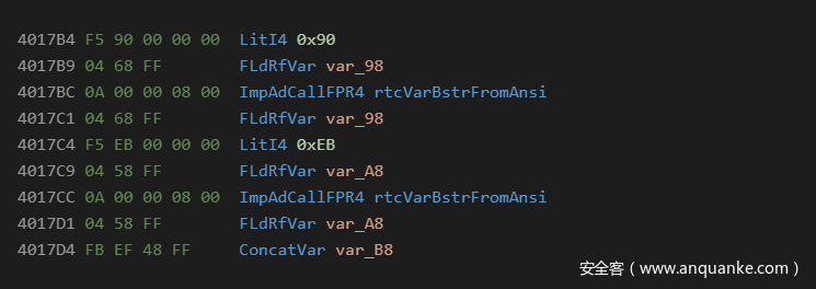 在asm语言级别,这有助于拆分字节值,并将其与操作码放在一起,防止自动检测或显示为字符串。对于本地VB6代码来说,它看起来像下面这样: