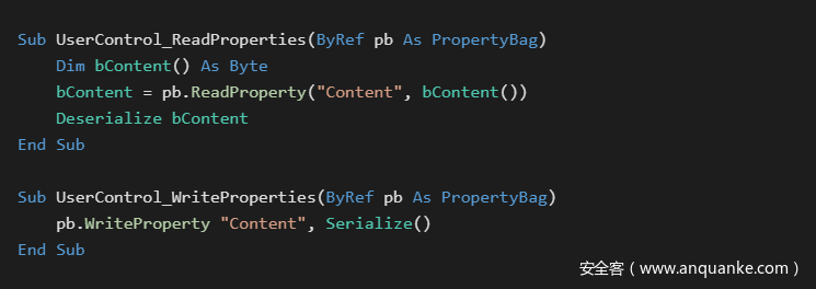 在上述技术中,有一个特例,那就是内置的UserControl类型。这个控件用于托管可重用的视觉元素和创建OCX。该控件有两个事件,它们被传递给一个包含其内部二进制设置的PropertyBag对象。这种二进制数据可以在IDE中通过属性页轻松设置。这种机制可以用来存储任何种类的二进制数据,包括整个文件系统。关于这种技术的公开样本,请参阅[3]。需要注意的是,嵌入的数据将保存在宿主表单UserControl的每个实例的属性中。