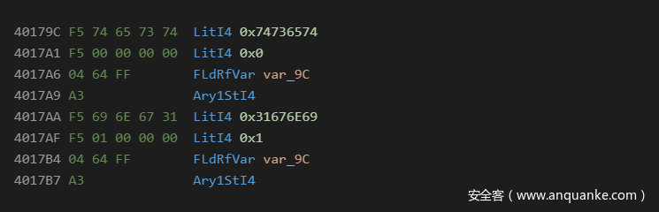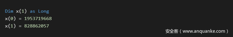 数值数组是恶意软件中的一种相当标准的技术,用于拆分程序操作码中的二进制数据。它类似于Chr技术,不同之处在于,它能够以更紧凑的格式保存数据。这种技术最常用的数据类型是4字节的long类型,和8个字节的currency类型。这种技术的主要优点是,数据易于通过数学方法进行处理,从而实现即时解码。