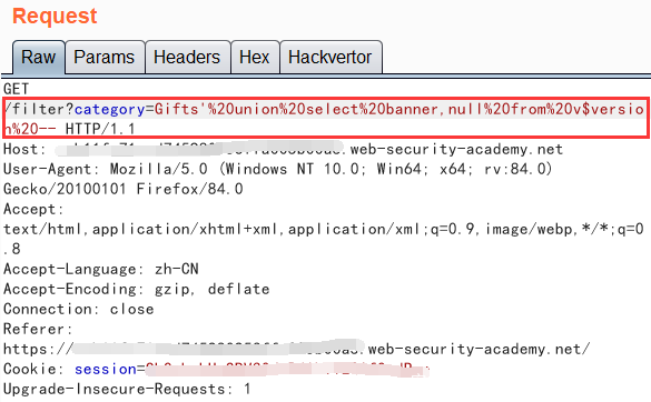 这里可能会有人有疑问了,为什么会有加号,这是因为URL必须是一连串的嘛,如果中间有空格的话可能会出现未知的情况,但也不是不能用空格,只不过要使用空格的URL形式(%20),那么这条请求拼接到查询语句中是什么样的呢?SELECT * FROM products WHERE category = 'Gifts' OR 1=1--' AND released = 1