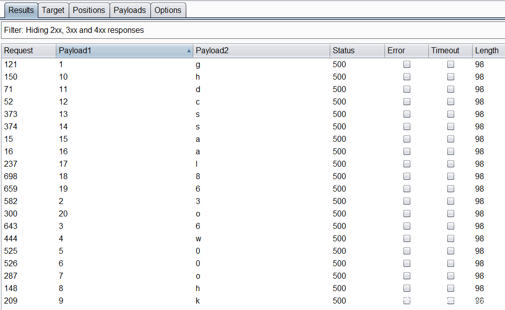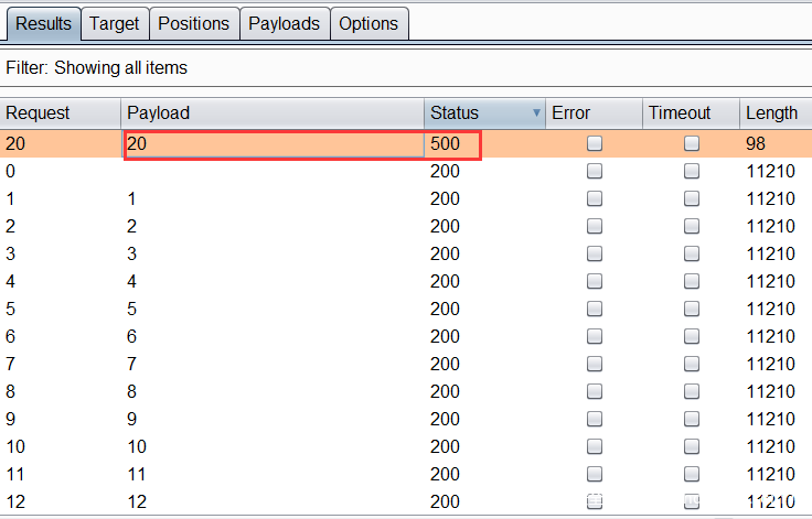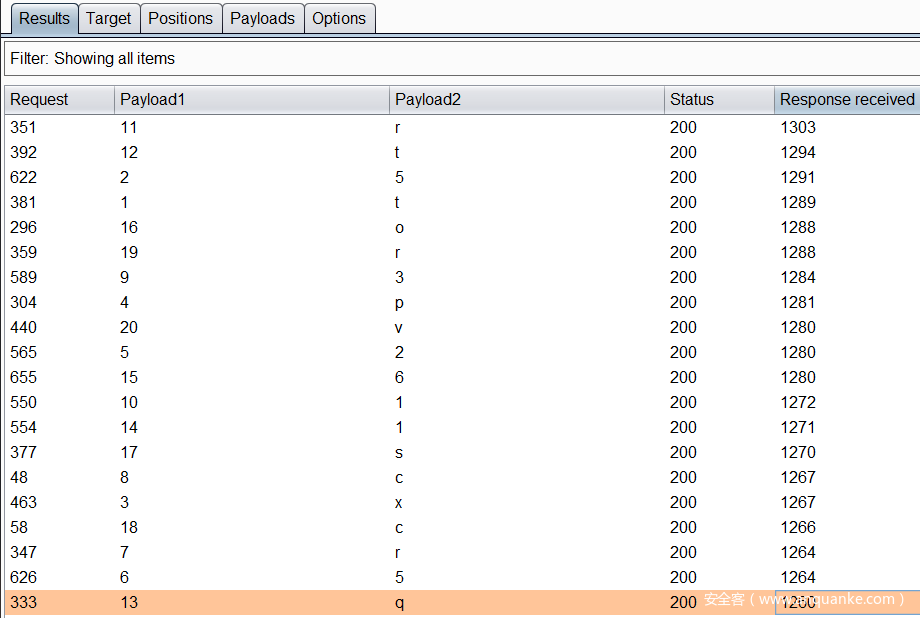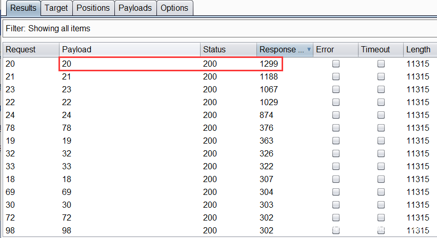 我们一定要选择Response received,这样就可以按照响应时间排序了,从结果来看密码长度为20,然后我们就开始爆破每一位密码,这里要注意的是,为了保证结果的准确性,我们只能开单线程,所以需要耐心等待哦
