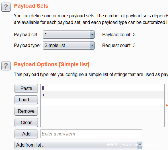 选择Pitchfork模式是因为这两个变量需要是一样的,就是一对一的关系,我们再设置一下fuzz列表