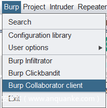 上面这条命令在执行的时候会发出一条向0efdymgw1o5w9inae8mg4dfrgim8ay.burpcollaborator.net的DNS查询请求,然后我们就可以在接收客户端接收到这个请求了,下面梨子来简单演示一下,首先打开burp,找到Burp Coolaborator client