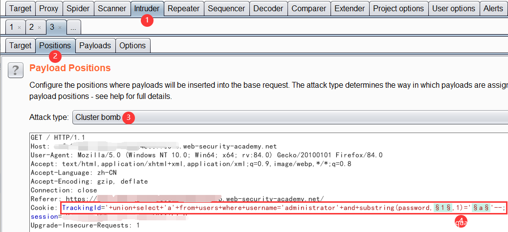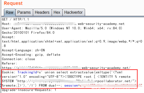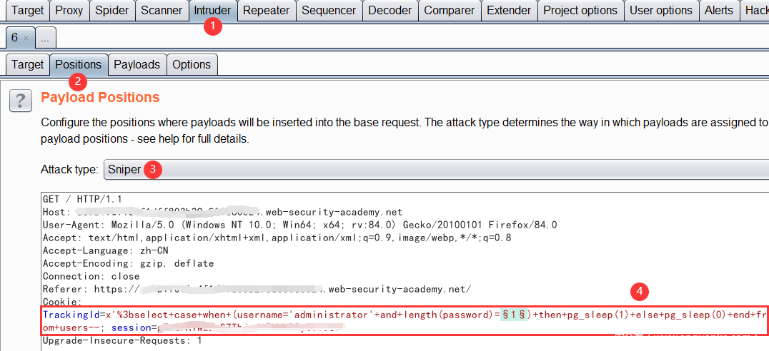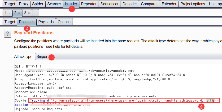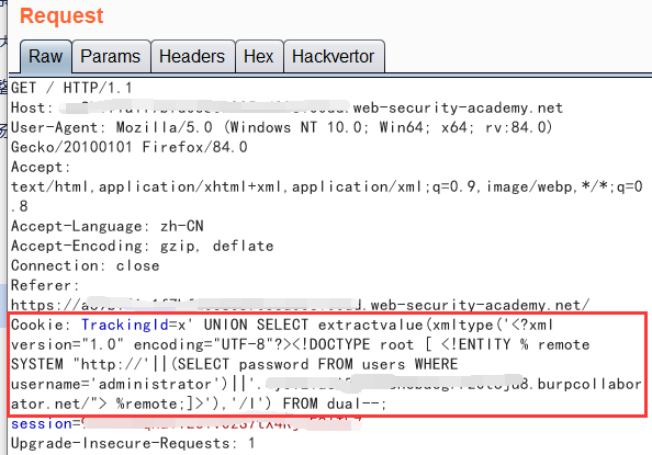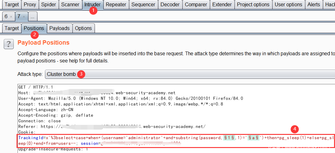burp通过在Cookie处引发的盲注来辅助讲解盲注,例如我们看到这样的一个Cookie字段Cookie: TrackingId=u5YD3PapBcR4lN3e7Tj4