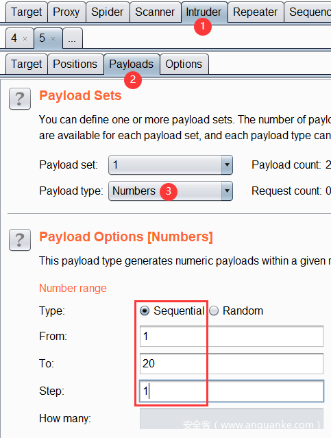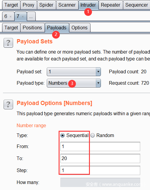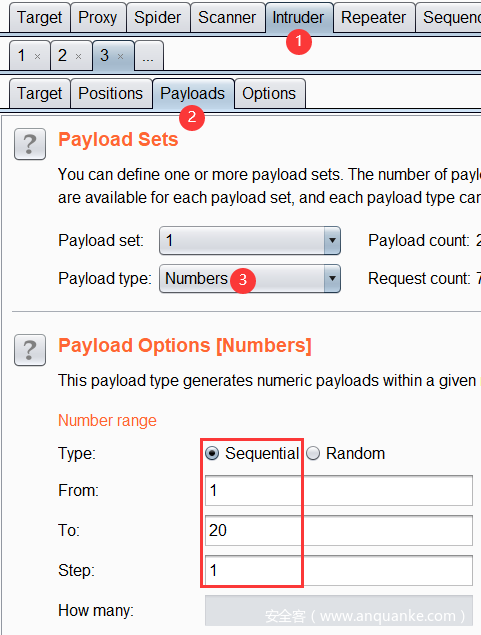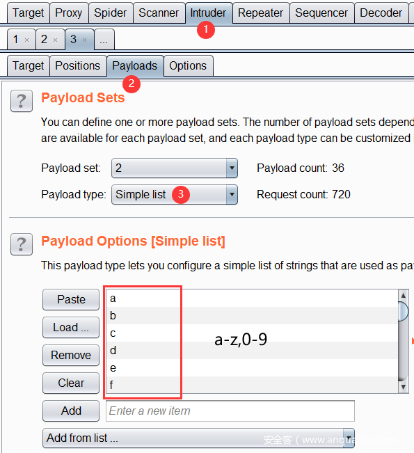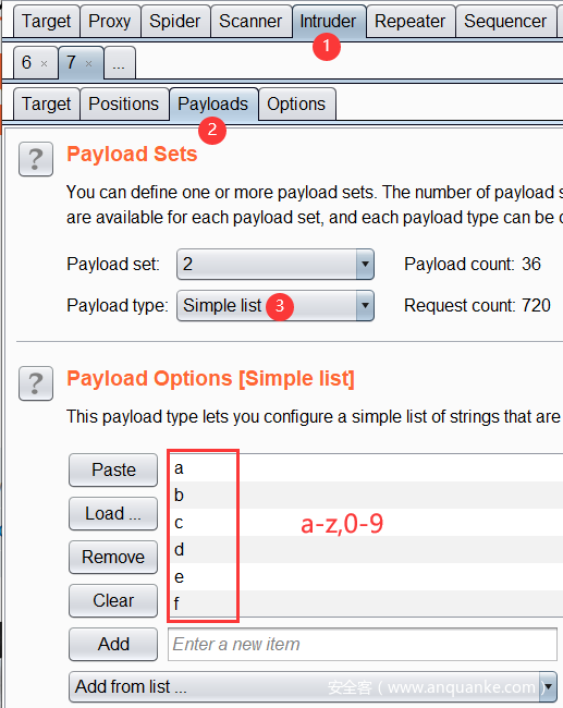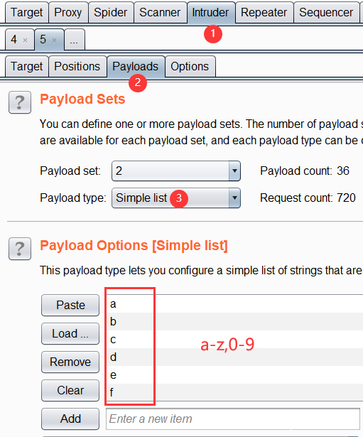 这里我们解释一下为什么是两个变量,因为我们前面讲过截取函数是靠第二个参数值来移动截取的,所以我们要把它设置为一个变量,第二个变量就是猜解这一位是哪个字符了,这里我们采用的是等于,其实和那个二分法差不多,因为需要排列组合,所以我们采用Cluster bomb模式,然后我们给这两个变量位设置爆破列表