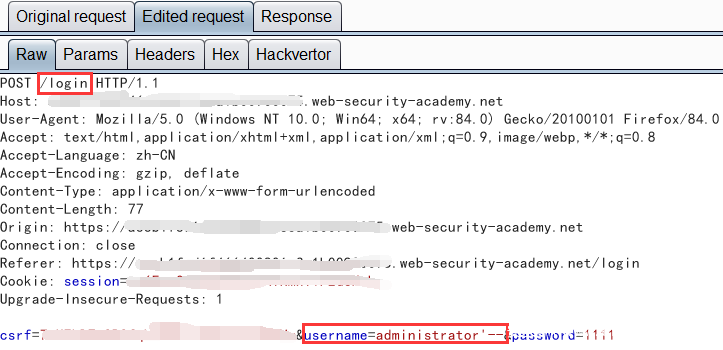 我们进入登录页面,把请求发到Repeater里,因为登录请求属于POST请求,所以参数是在body里面的,于是我们向用户名参数中插入payload