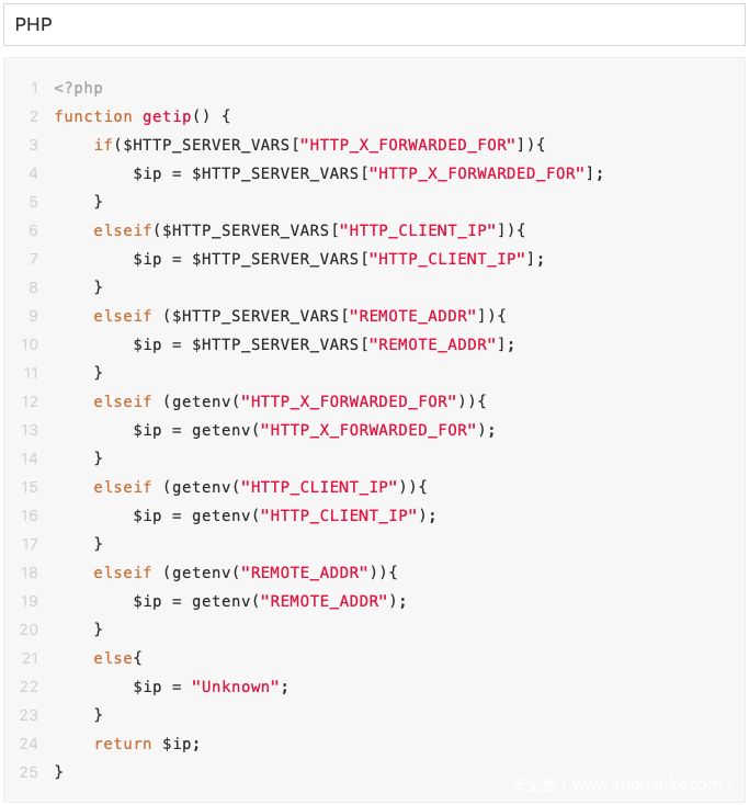 攻击者有意或无意上传存在风险的代码块,经过互联网中的扩散,使得在搜索引擎中存在较大优先级,开发在搜索相应功能的实现时,很容易直接将代码贴入项目,这就带来了风险的引进。最有代表为PHP中getip函数,该函数可以很轻易的通过修改请求头来修改用户IP,结合其他代码逻辑也可能引入SQLi及XSS问题。