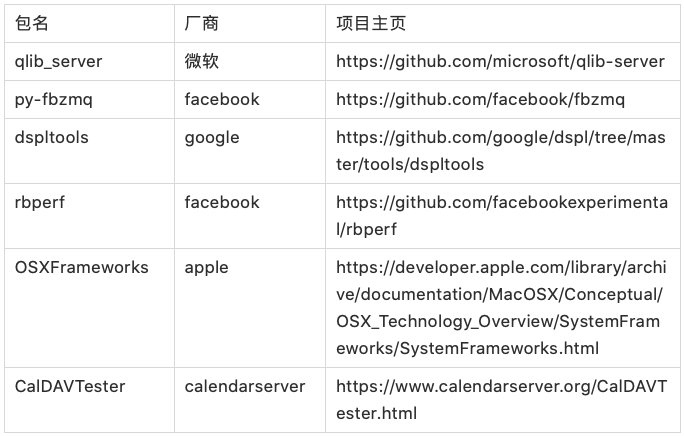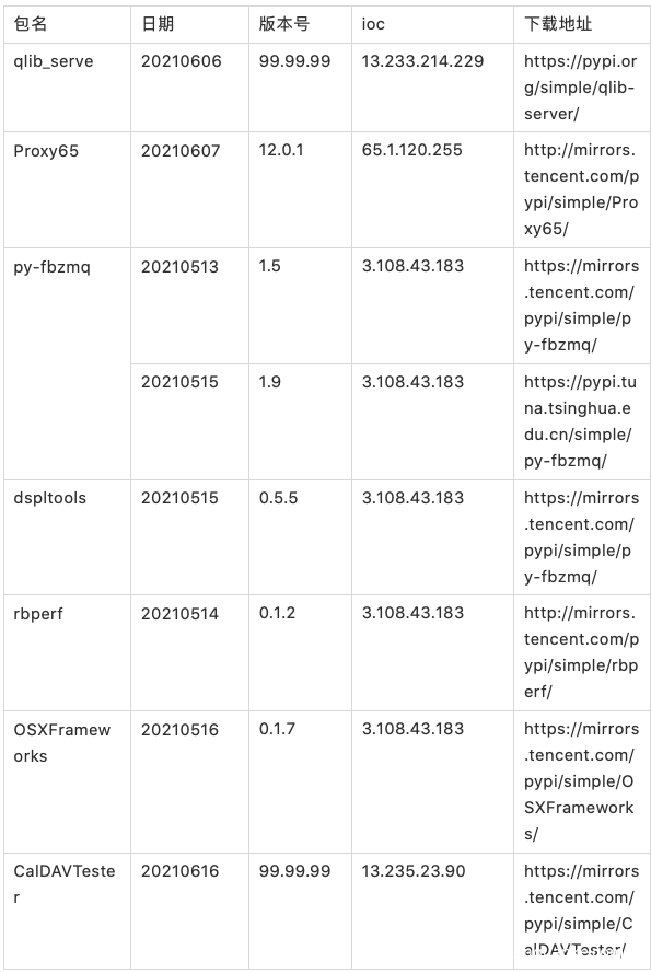 恶意包名:qlib_server、Proxy65、py-fbzmq、dspltools、rbperf、OSXFrameworks、CalDAVTester
