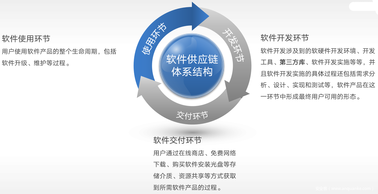 传统供应链的模型可以完全套用到计算机软硬件中,这样就衍生出了软件供应链的概念:软件在开发、交付以及使用过程中所涉及一系列行为、工具所共同组成的软件体系结构。