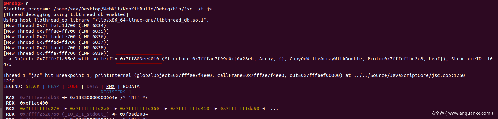 从中可以看到GetByVal中传递的参数中含有InBounds标记,那么其汇编代码中将不会检查下标是否越界,因为前面已经确定下标在范围内。为了查看FTL JIT生成的汇编代码,我们使用gdb调试,遇到print语句时会断点停下