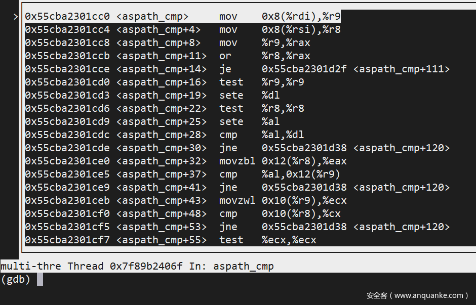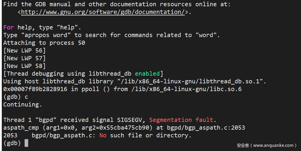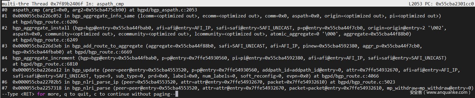 等coredump的时候,gdb会自动断下来,显示代码停在了bgpd/bgp_aspath.c:2053函数是aspath_cmp