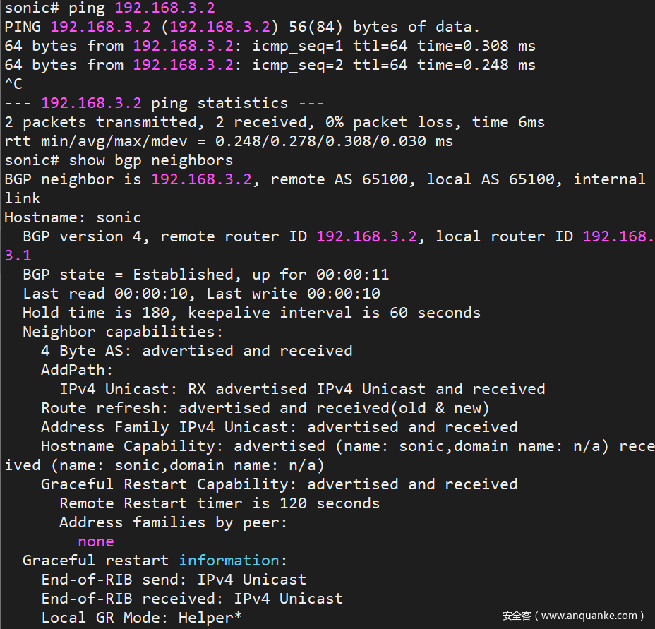 以SONIC1为例,执行了ping 192.168.3.2和show ip bgp neighbors进行结果验证: