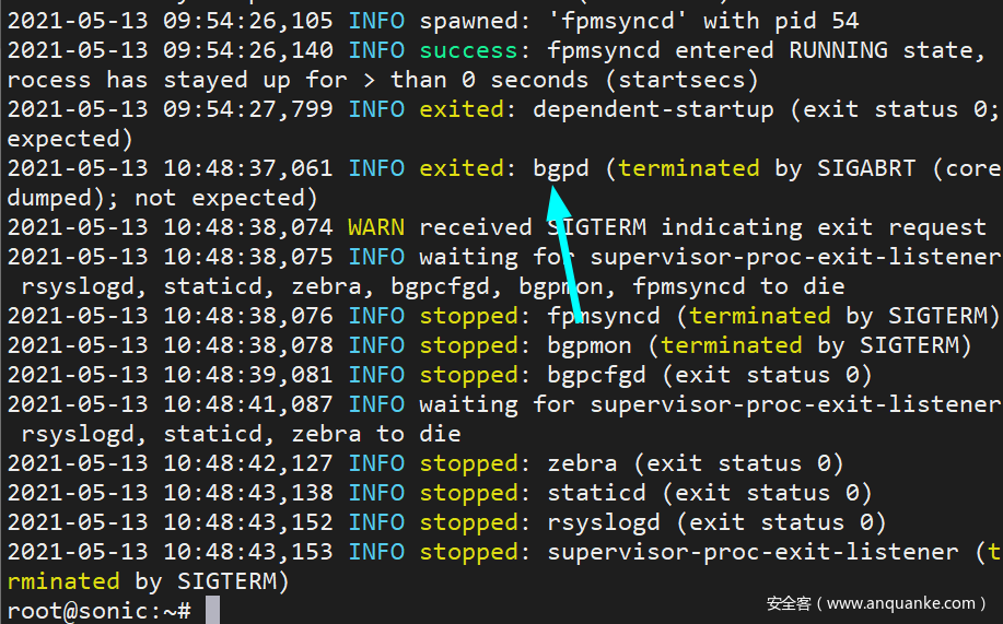 在SONIC1敲docker logs bgp,可以在日志里看见bgpd非正常退出了