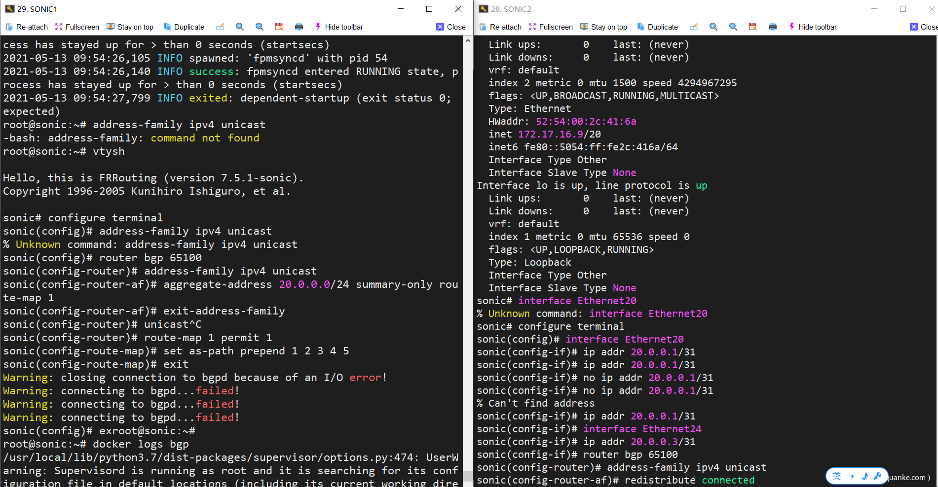 敲完最后一句后,过一会SONIC1的终端就有bgpd服务掉线的反馈信息