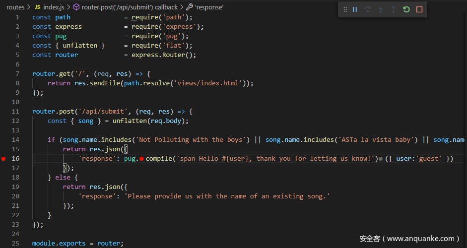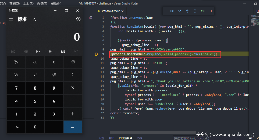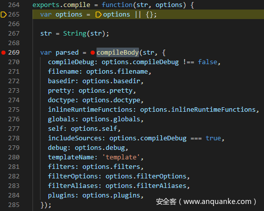 存在原型链污染,题目又没有别的可利用点,所以只能考虑原型链污染打pug.预期解应该是使用POSIX 师傅这条公开链打, https://blog.p6.is/AST-Injection/ . 但是当时我还不知道pug有一个现成的原型攻击链,所以就尝试手动调试挖掘下,就开启我的模板引擎调试之旅.