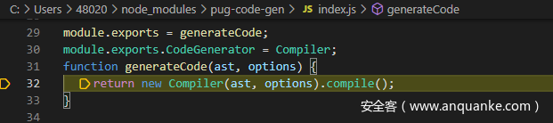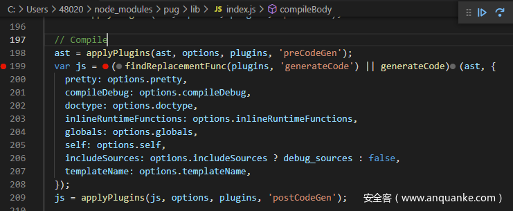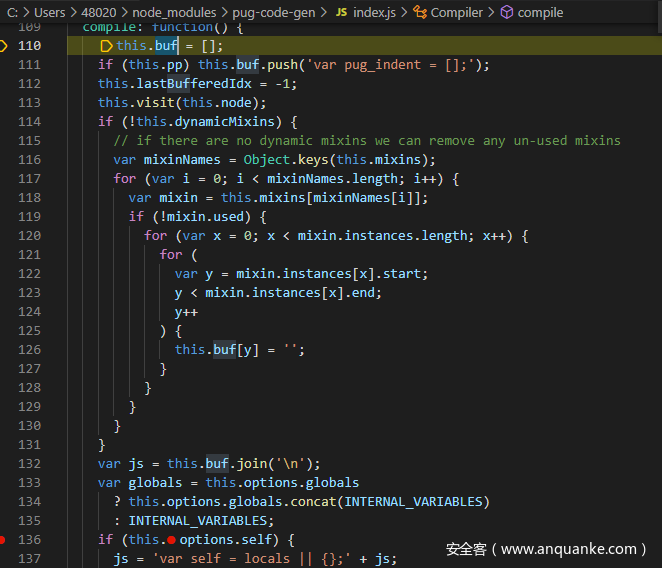 调试的时候会发现下面这端代码, this.visit,这段代码对于调试过jade RCE链的人来说必定很熟悉,因为jade的恶意代码就是通过污染node.line拼接到模板函数里面的.