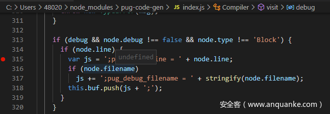 不存在node.line为undefined这个条件,我们可以自己创造条件( XD , 如果调试的够仔细的话可以发现在visitCode()函数中存在code.block为undefined的情况.block值不为空就会调用this.visit,进而有node.line为undefined的情况