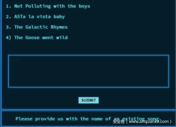 "song.__proto__.name":"Not Polluting with the boys, ASTa la vista baby,The Galactic Rhymes, The Goose went wild"