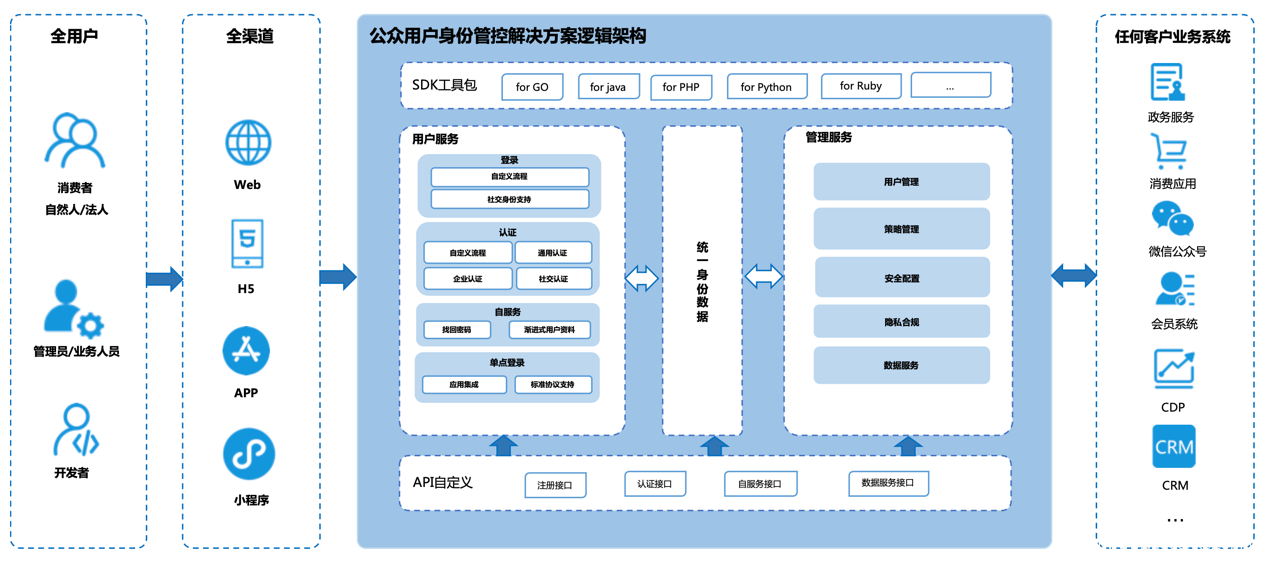 当选运用潜力类推荐方案的公众用户身份管控解决方案,针对数字化转型浪潮下,政府和企业大量的个人业务向线上转移的现状,基于快速认证接入能力、高可用高性能设计、身份账号清洗/聚合技术、基于风控的身份认证设计等优势能力,保障所有用户(自然人/法人、消费者、管理员等)通过全部渠道(web、小程序、 APP、H5)访问任何开放业务系统具有一致的体验,同时确保业务访问过程中的安全。