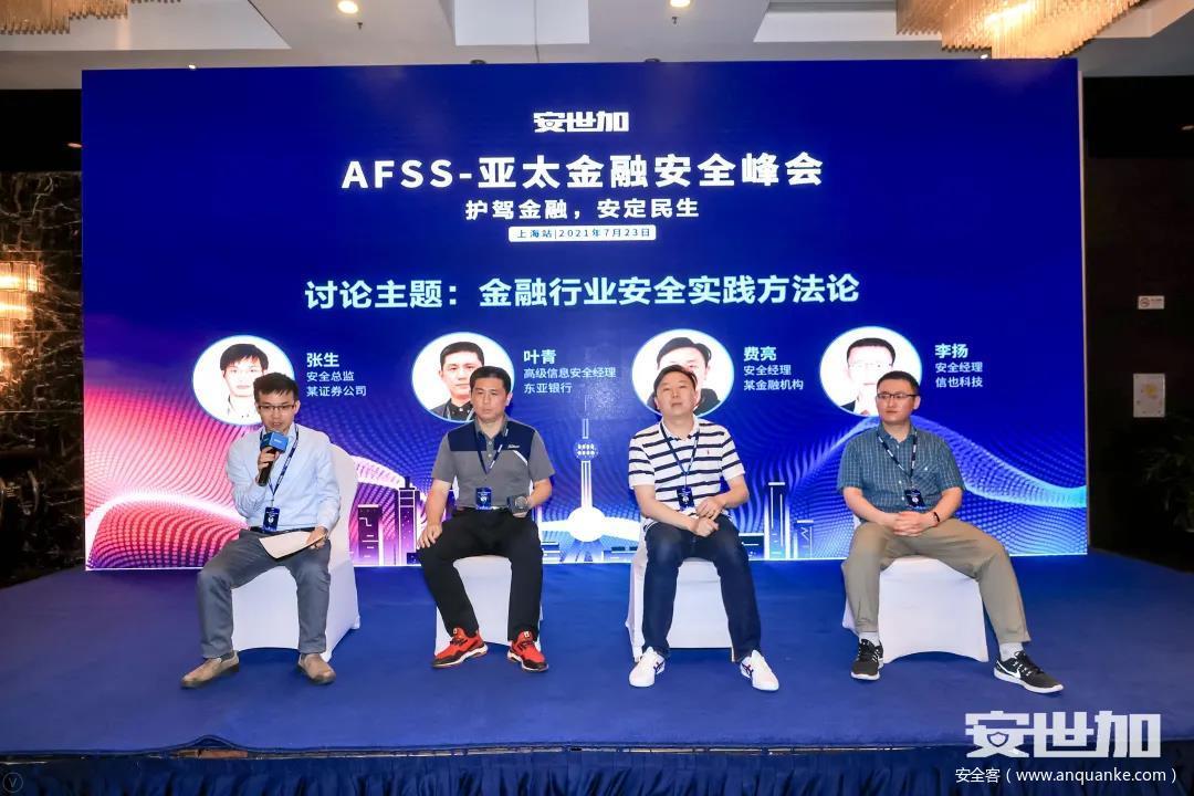 本次峰会的最后一个环节是由四位嘉宾组成的小组讨论:金融行业安全实践方法论。他们分别是来自某证券公司的安全总监 张生,东亚银行的高级信息安全经理 叶青,某金融机构的安全经理 费亮,信也科技的安全经理 李扬。