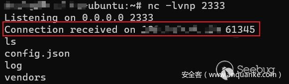 随后即可在远程服务器上收到来自命令执行反弹的 shell。