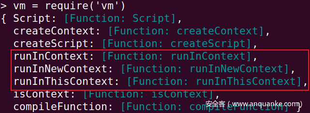 vm 模块并不是一个完全安全的动态脚本执行模块。先来看看 vm 有哪些执行命令的函数。