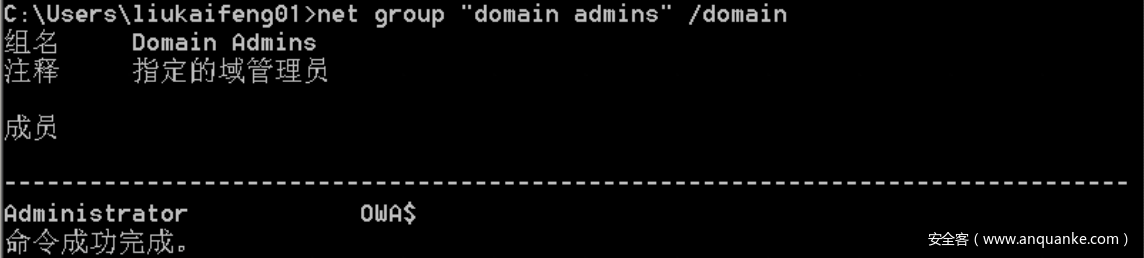 此命令可以看出域内管理员有Administrator和OWA,意味着我们后续的目标权限尽量向这两个角色靠拢,这就是这条命令的意义所在。