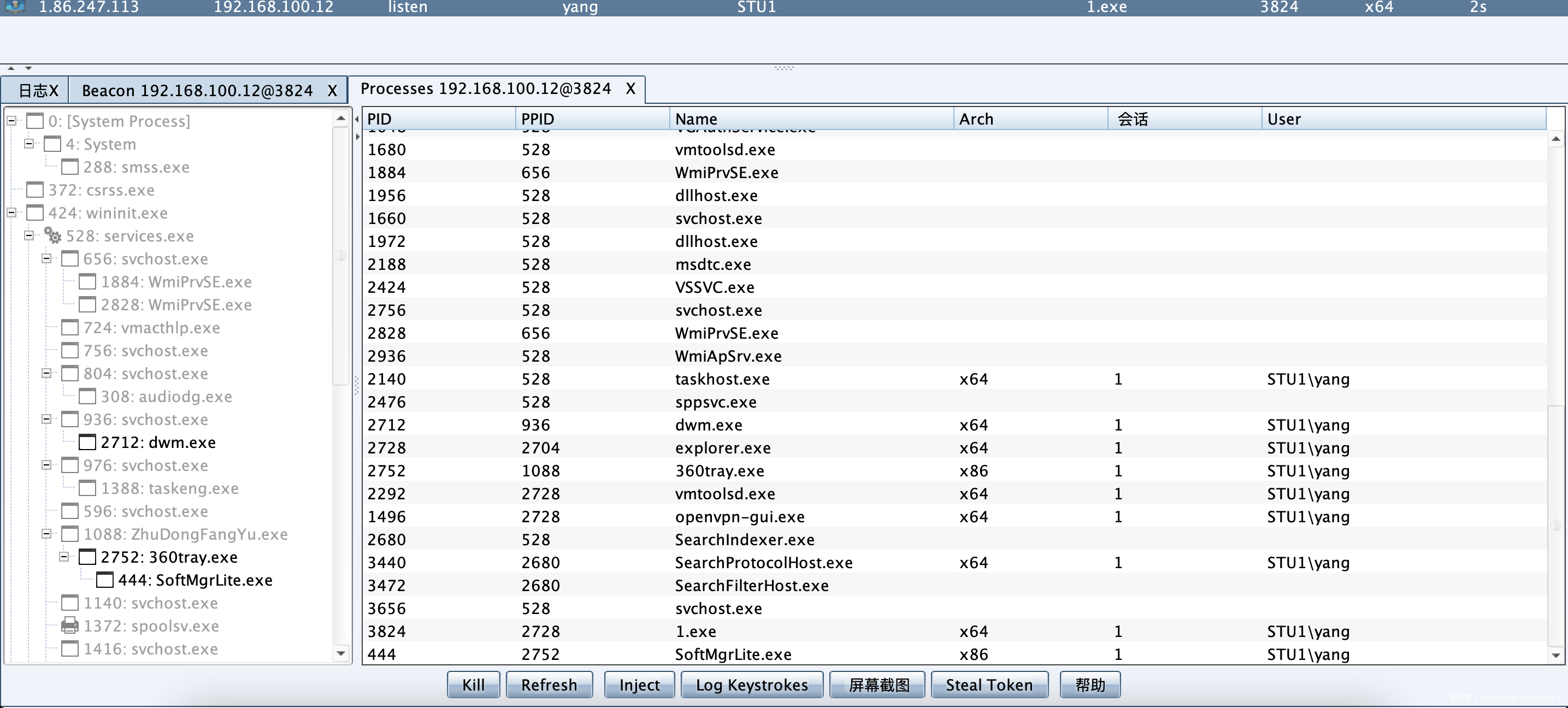 我们登陆刚刚创建的低权限的账户,然后运行我们的exe木马回连。然后看CobaltStrike中的进程列表