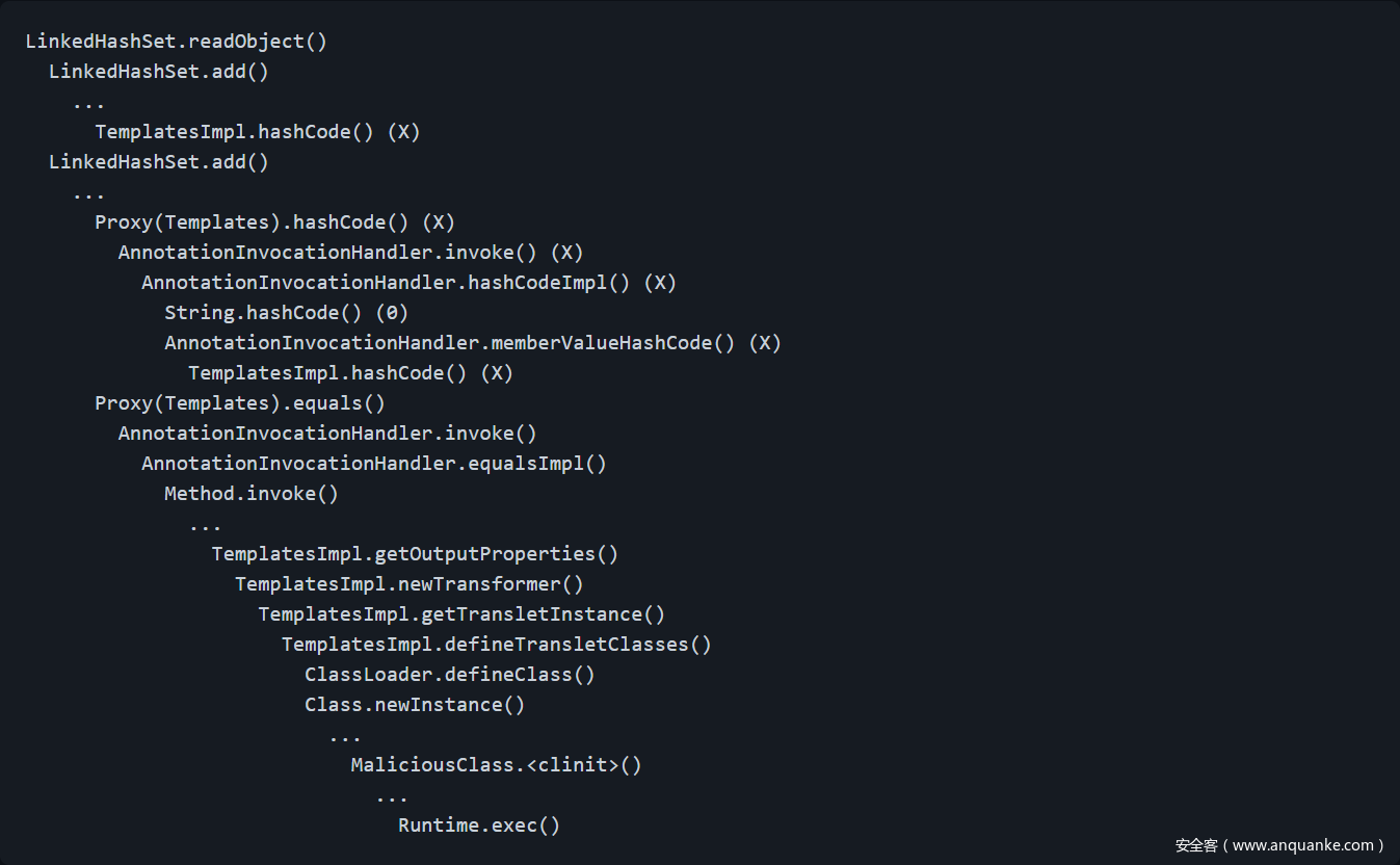 2.利用链的串联,可以通过反向寻找方法的调用,可以借鉴常用的一些反序列化载体如HashMap、HashSet、AnnotationInvocationHandler等。