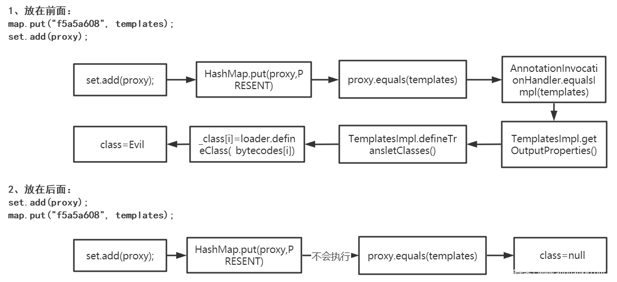 - 放在后面,set.add(proxy);正常添加没有触发执行proxy.equals(TemplatesImpl实例),并未触发Templates.getOutputProperties()->_class[i]=loader.defineClass(_bytecodes[i]),所以templates._class还是null,在反序列化时也是正常反序列化,只有在反序列化了proxy并将其put到hashmap时才触发了执行,这时候通过读取_bytecodes将类赋值给templates._class就不会报错。