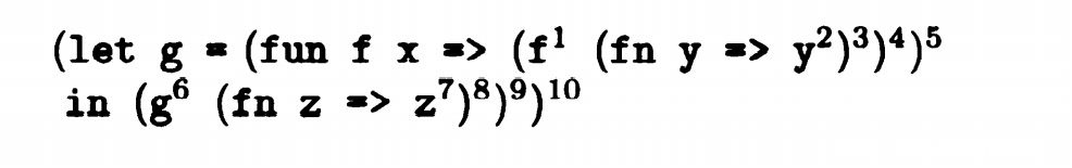 最终的表达方式是bind[g -> f] in (f ^6 id_z ^8) ^9。也就是先进行f操作再进行z操作得到的最终结果:(bind [ g -> f] in (bind [ f-> f] [x -> id_z] in (f ^1(fn y => y ^2) ^3) ^4) ^9) ^10)