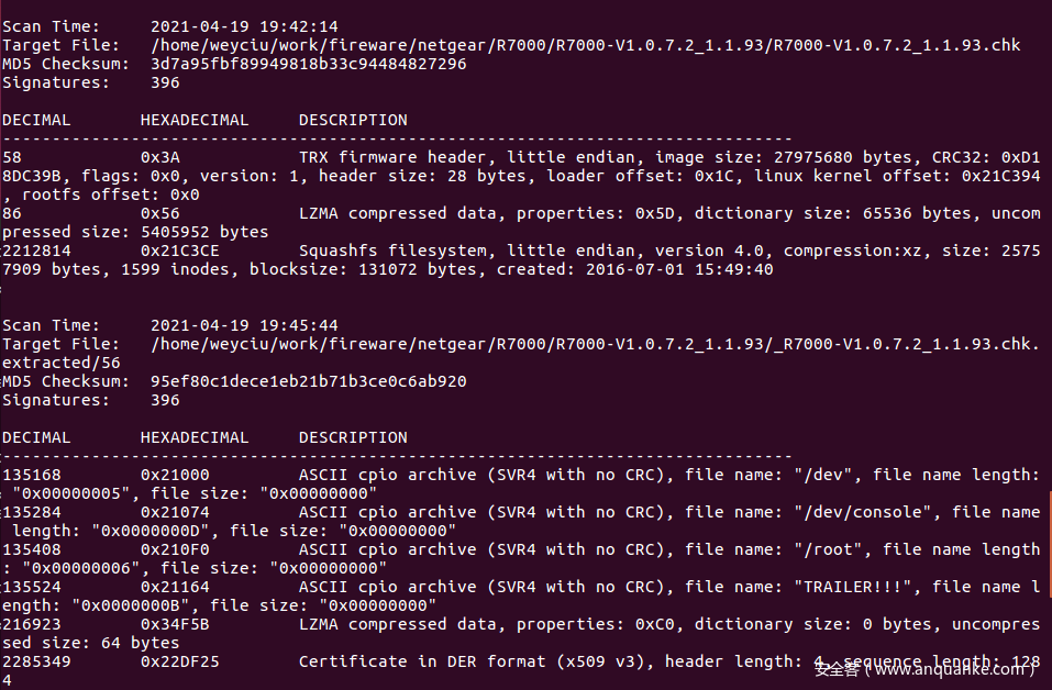 使用 binwalk -Me R7000-V1.0.7.2_1.1.93.chk 即可解包成功(固件没有加密,可直接分析)。