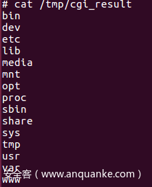 sprintf(cmd, “/www/cgi-bin/%s > /tmp/cgi_result”, v41); 通过该命令可以看出,如果将 %s 换成 ;ls 的话,/www/cgi-bin/;ls > /tmp/cgi_result 那么就会将ls的结果存放到 /tmp/cgi_result,假设 /tmp/cgi_result 可以看到ls的结果,那么证明漏洞就存在此处。如图6是通过开放telnet端口进入之后,查看 /tmp/cgi_result,最终发现和预想的一样。如图5所示,如果需要cmd参数执行成功,那么v41参数就必须可以控制。