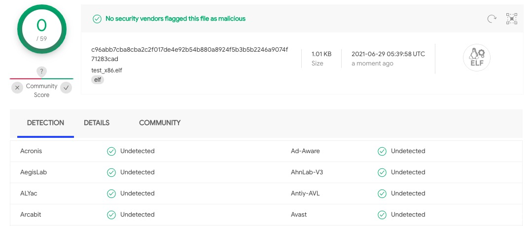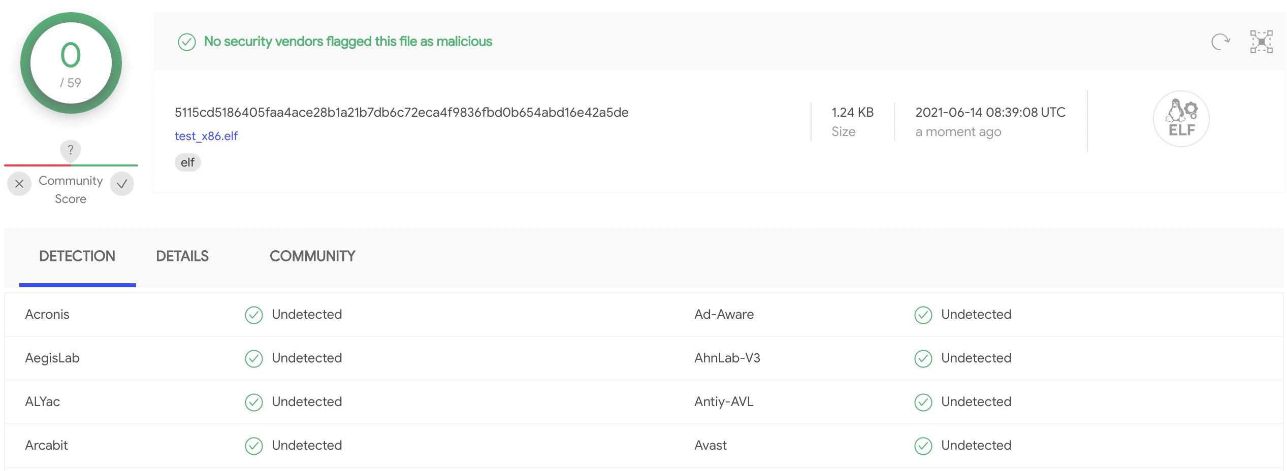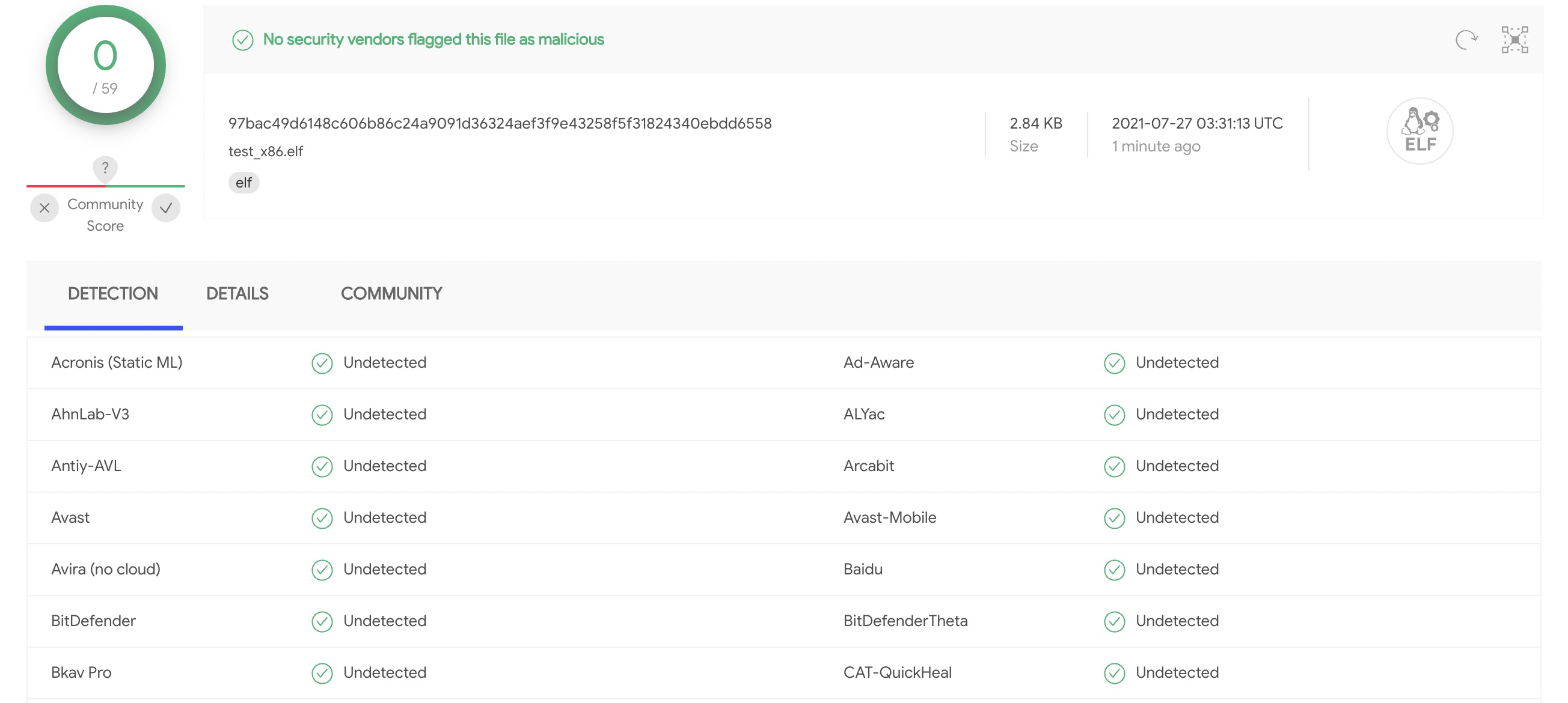 在上一节我们已经通过自己编写的编码器对shellcode进行了编码,并且构建了一个ELF文件,但是出乎意料的是McAfee 和 McAfee-GW-Edition 还会报毒为木马,经过我的研究,我发现McAfee判黑的逻辑非常简单,只要文件大小小于某个阈值,并且EntryPoint附近有无法反汇编的数据,就会被报黑。这么看来,想让上一节的ELF文件不被所有的引擎检测就非常简单了,只需要在文件结尾再写一些乱数据就搞定了。