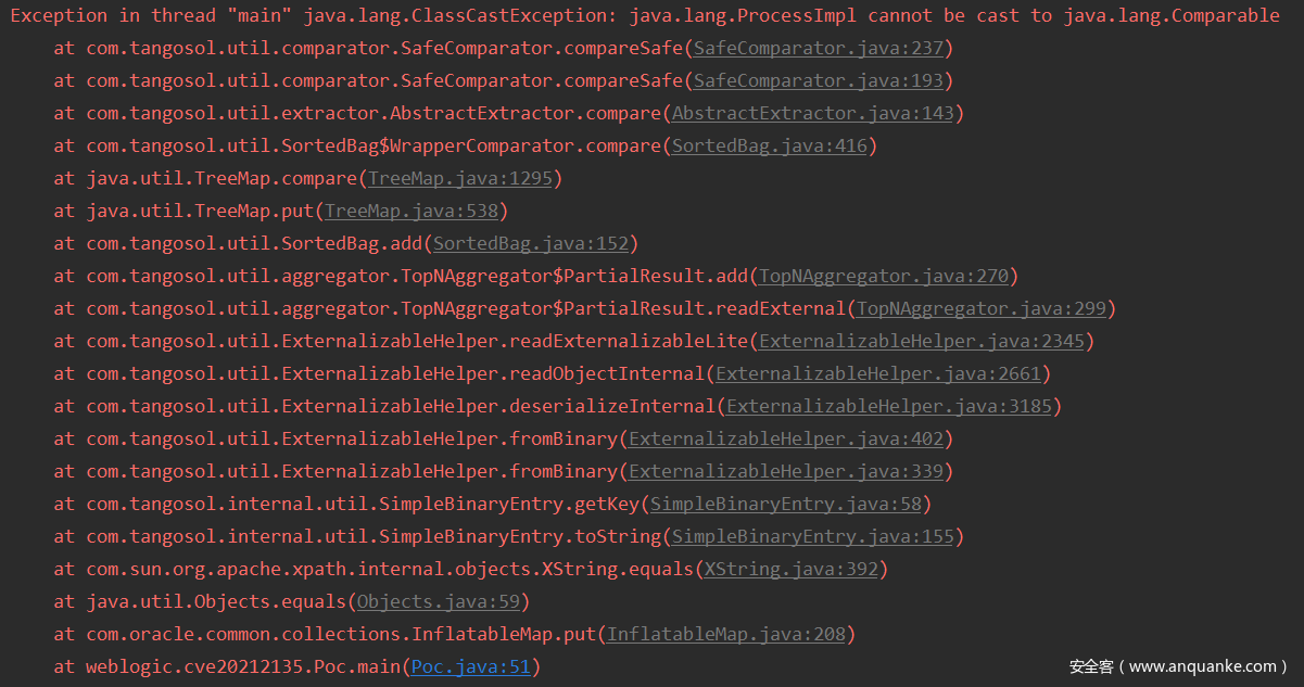 在用y4er CVE-2020-14756的POC时也报了错:ClassCastException,但不影响执行命令,但是我的POC在序列化也执行了命令,所以才会报这个错并且导致程序执行不下去。
