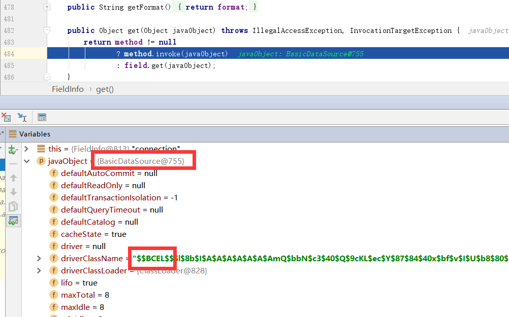 最终触发点,其中driverClassName和driverClassLoader都是可控的,由用户输入,指定ClassLoader为com.sun.org.apache.bcel.internal.util.ClassLoader,设置ClassName为BCEL...这种格式后,在newInstance方法执行后被实例化。第二个参数initial为true时,类加载后将会直接执行static{}块中的代码。