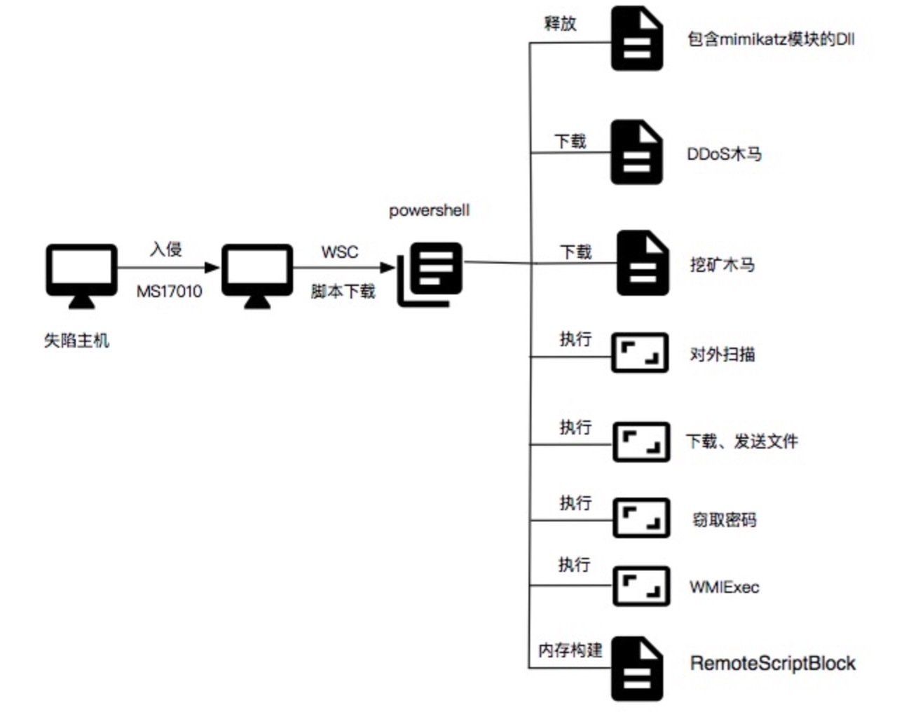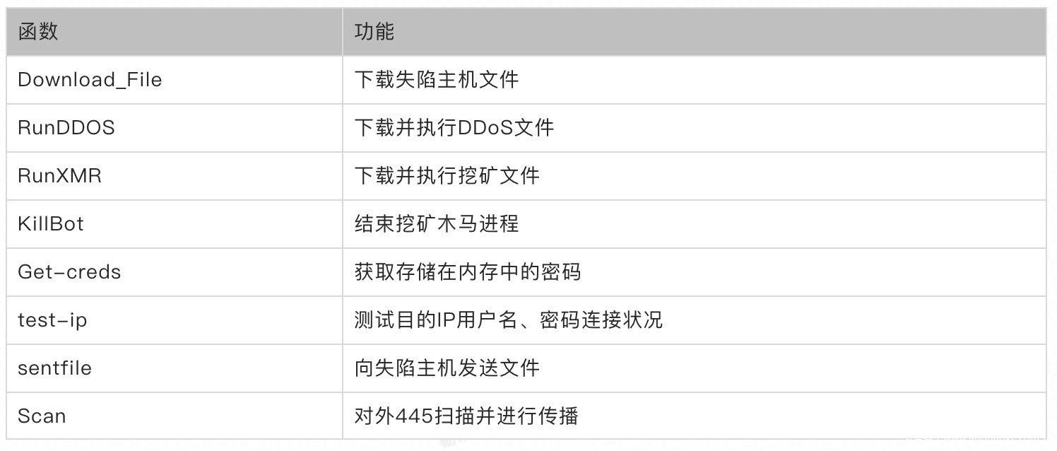 阿里云安全专家分析发现,该僵尸网络利用永恒之蓝漏洞进行扫描入侵,通过WSC(Windows Scripting Component)技术下载并执行核心Powershell脚本,实现文件下载、上传、对外DDoS、挖矿、盗取密码等功能,对主机、用户资产危害极大。